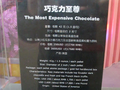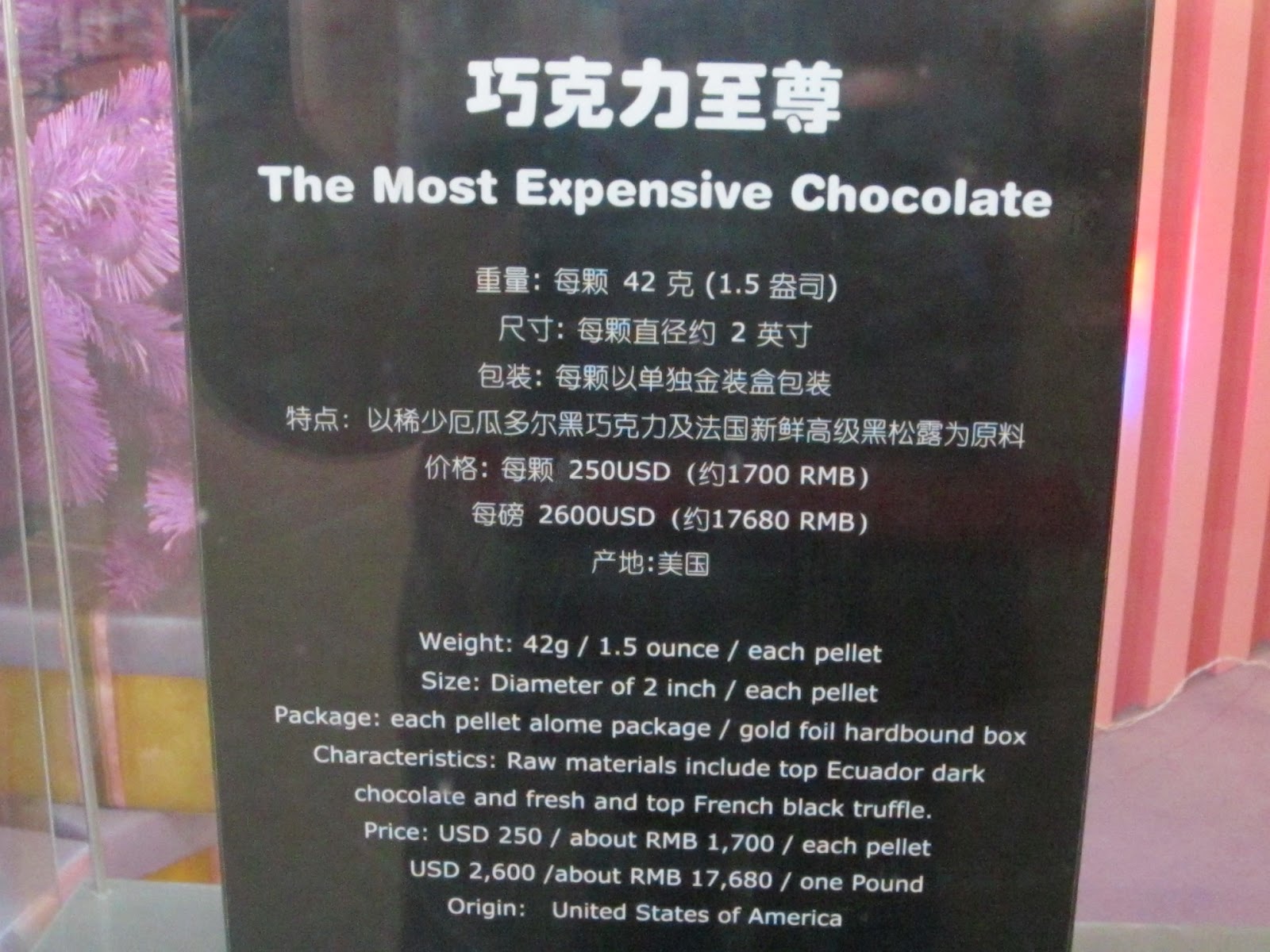 There was a store with chocolate made from camel milk, a more familiar Lindt chocolate (handing out free chocolate), Guylian chocolate, and then some very fancy expensive stuff. And then there was the shop. 100RMB was quite a lot for this as I only spent about an hour. Outside of the main exhibit was a small area set up for foods (chocolate) but this was full of kids. It was a good idea to come on Thursday as it was less busy and I could spend as much time as I wanted looking at things.