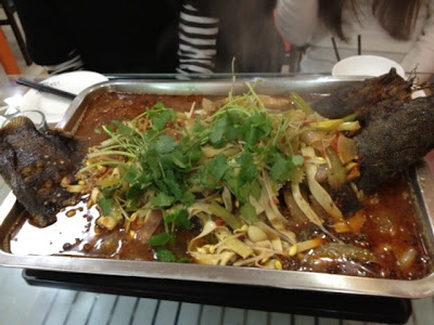 I came back and started working on a cross stitch and then my flatmates came back and we went out to a restaurant. It was a small place where you really need to know it because as a foreigner you'd not think to go into such a place. We had dishes that are from the area in China called Congming and it was very spicy. The fish was so fresh it was still alive, they only kill it when you order it. It was some kind of catfish. You then order other food to add to the hot pot. The fish is roasted and added into a spicy soup base and then you add vegetables and meat into it. Its a very social thing to do and we were there for hours! The fish was so delicious and fresh and I tried some kind of noodles made from sweet potato.